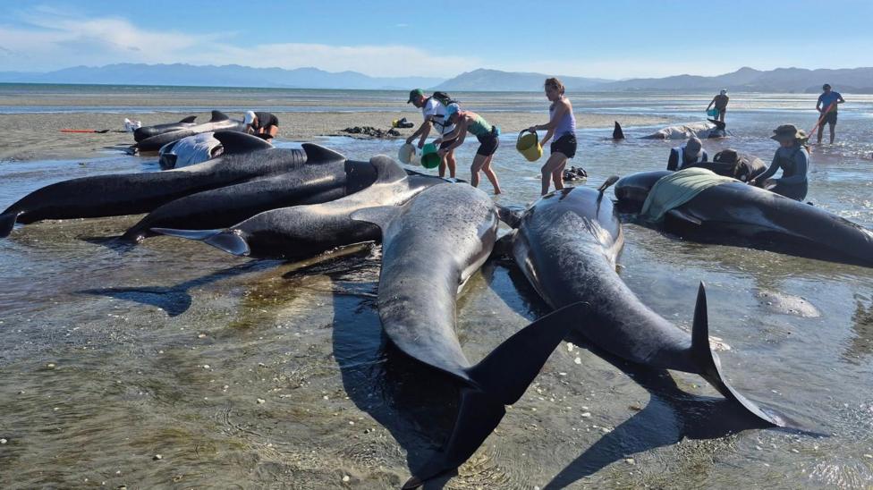 Volunteers at Farewell Spit are racing against time to get 15 live whales back into sea.